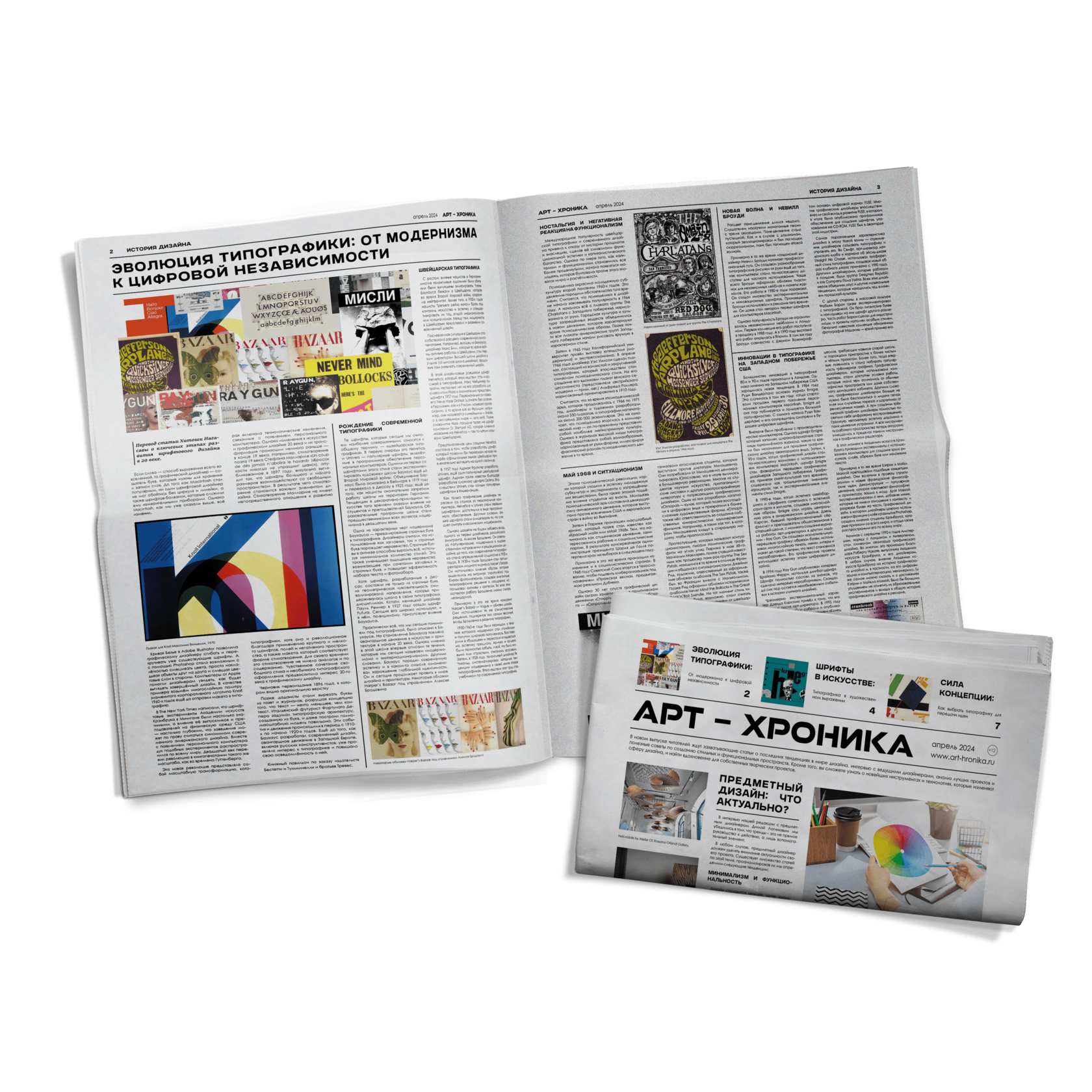Проект включал в себя верстку газеты "Арт-хроника", начиная от подготовки макетов разделов и страниц, до окончательной цветокоррекции и подготовки файлов для печати. Использование ярких иллюстраций и фотоматериалов позволили сделать газету не только информативной, но и визуально привлекательной.