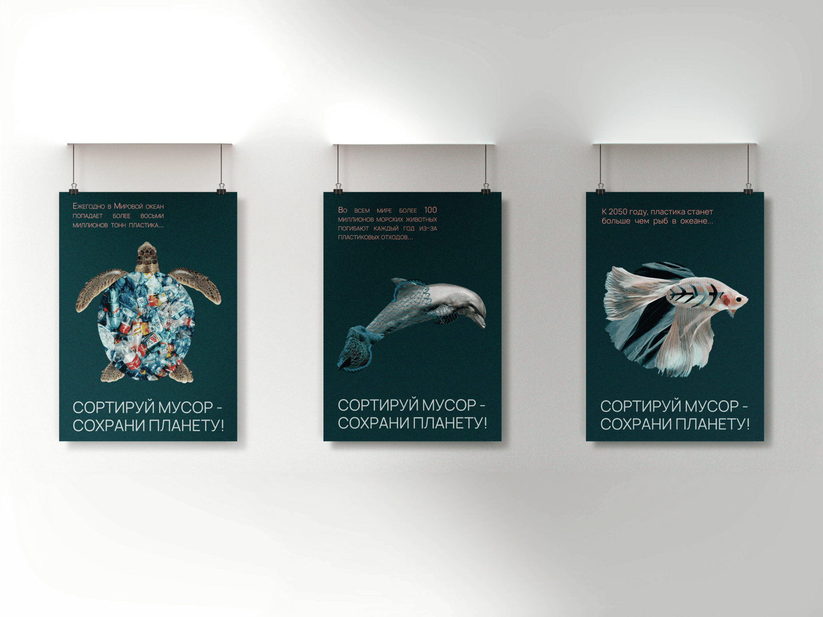 Серия плакатов, посвященная экологичной обстановке в океанах.